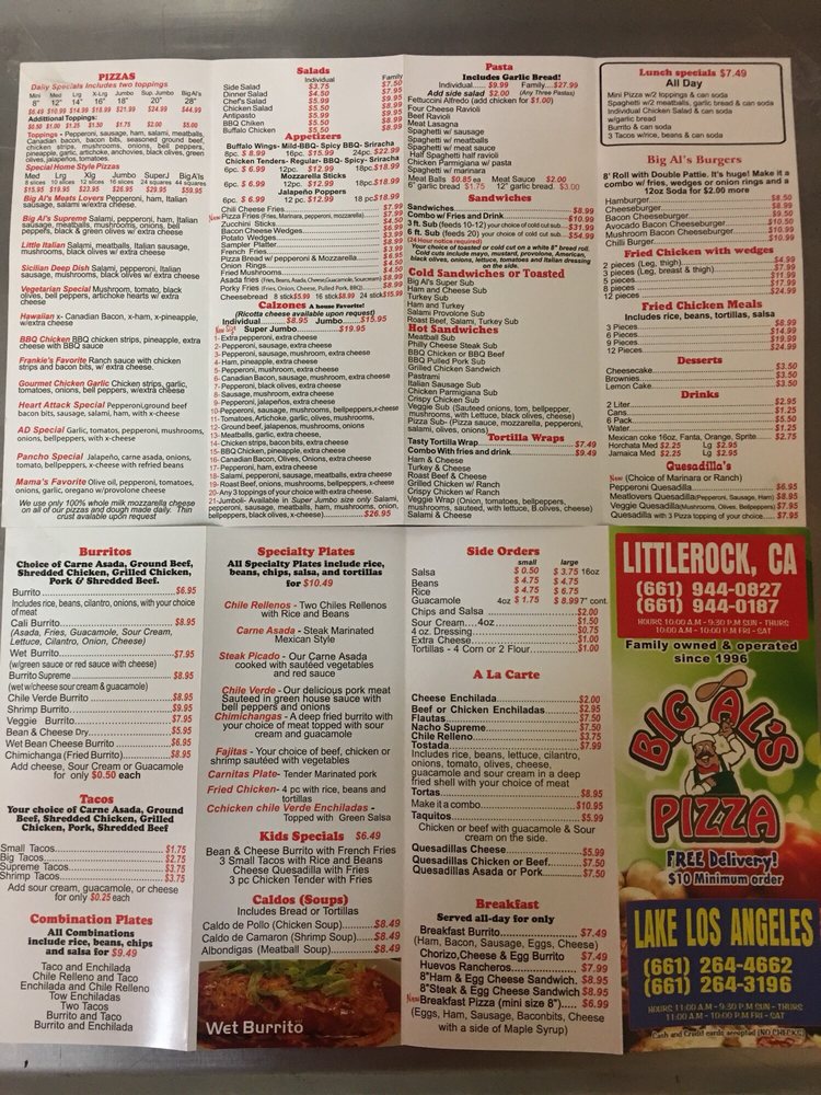 Welcome to Big Al's Pizza, a local gem in Littlerock, CA, renowned for its mouthwatering pizzas and inviting ambiance. This casual dining spot is perfect for lunch or dinner, offering a vibrant atmosphere complemented by friendly service and great music. The menu boasts a wide range of options, ensuring there’s something for everyone, including many vegetarian choices.